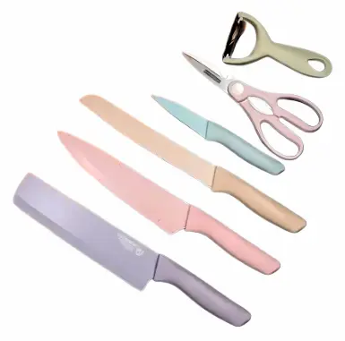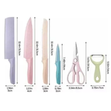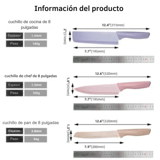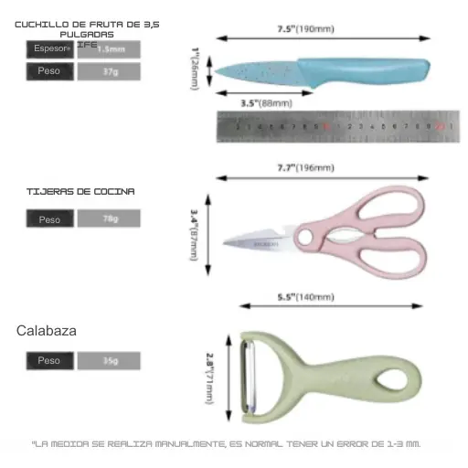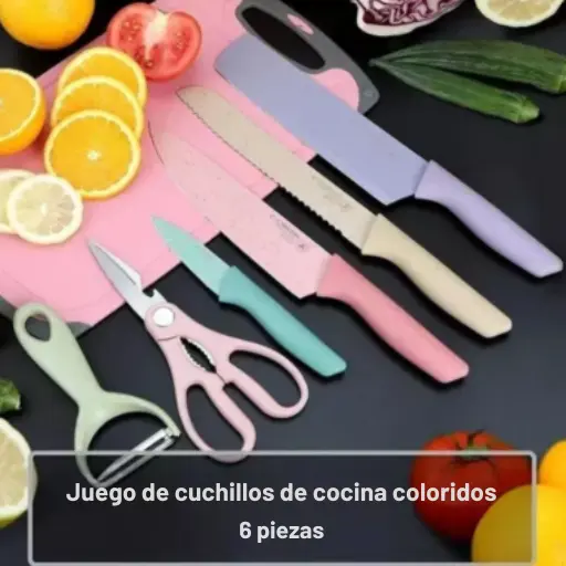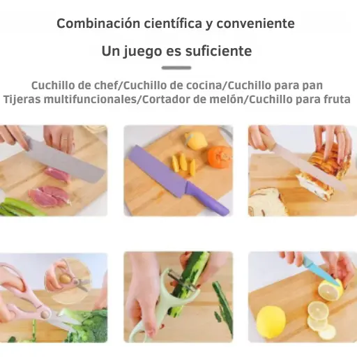 Este completo set incluye todo lo que necesitas: cuchillo de chef, cuchillo para tallar, cuchillo de filete, cuchillo pelador de cerámica, tijeras multiuso y pelador manual.